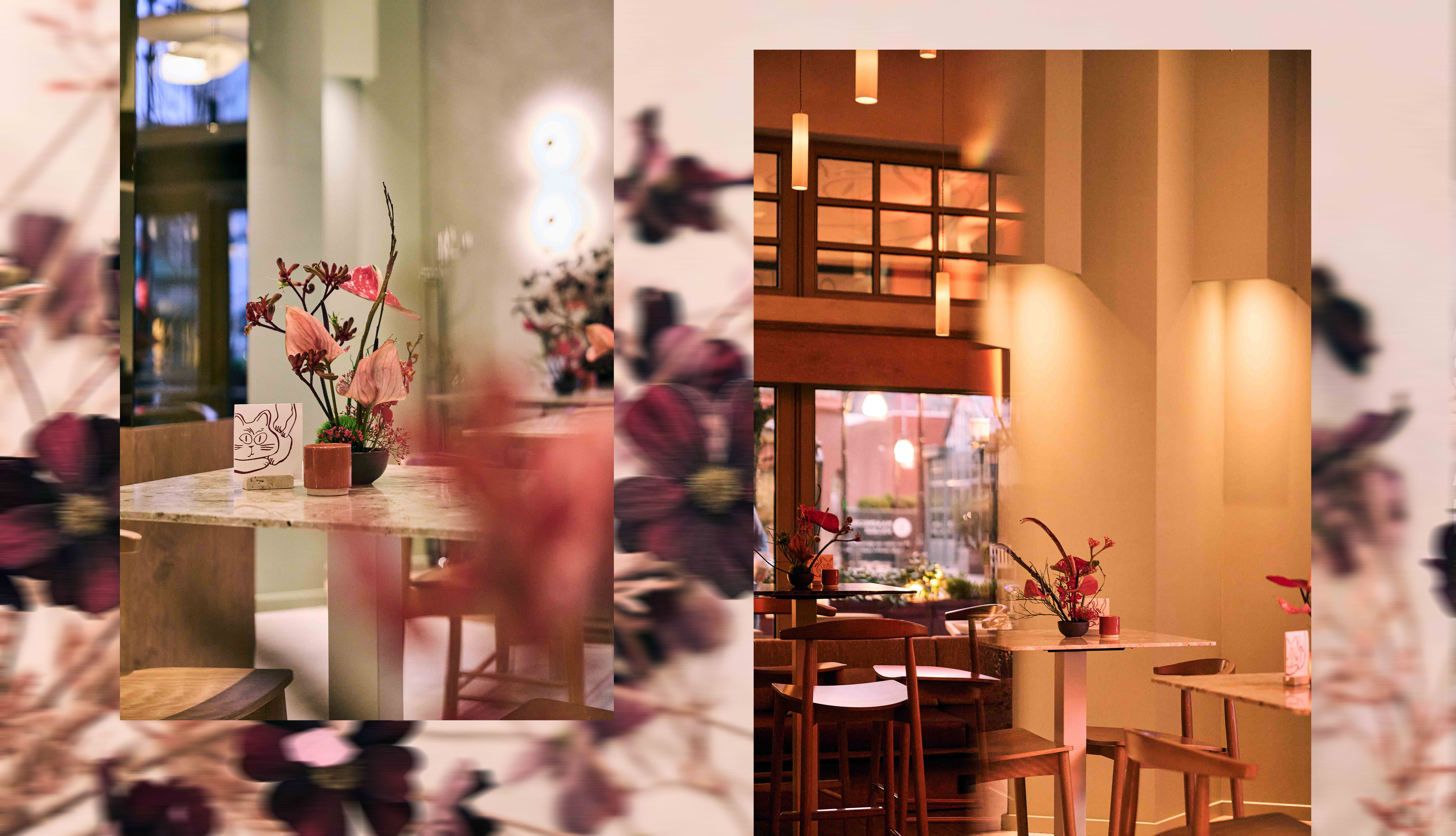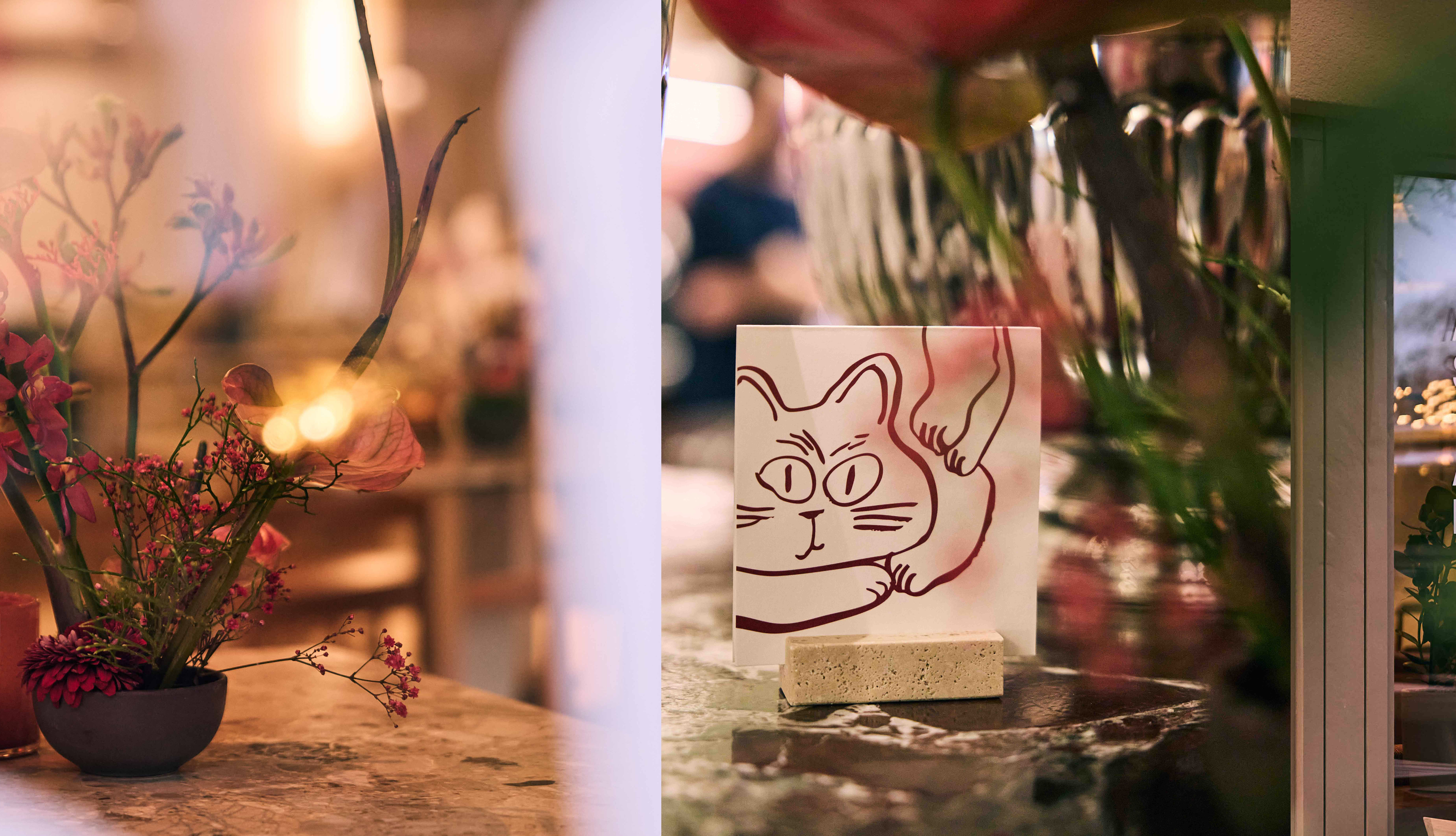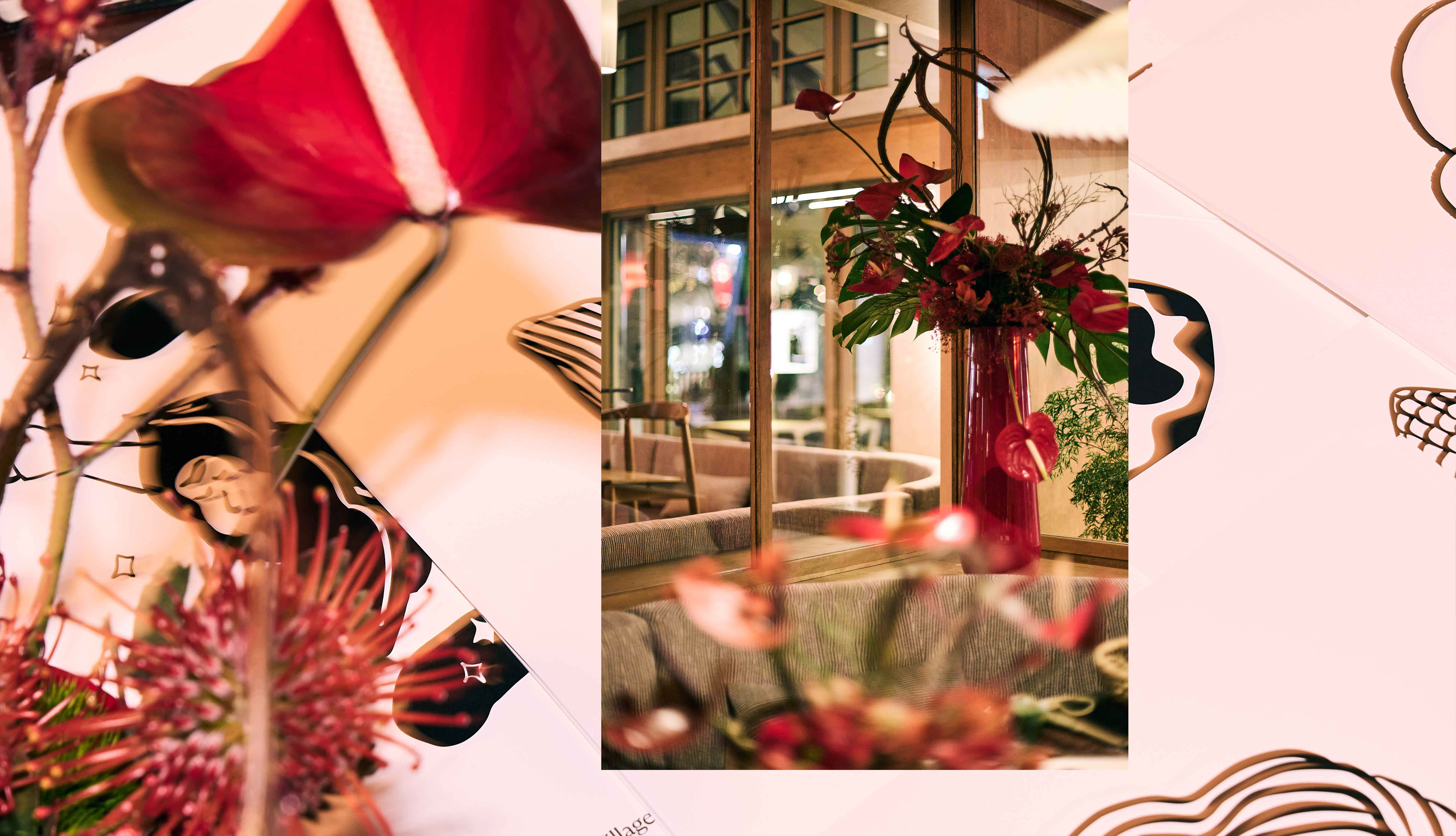 Floral design followed the principles of Ikebana: refined, architectural compositions that added both rhythm and restraint. Their sculptural presence complemented the vibrant artwork and warm lighting, creating harmony between tradition and modernity.