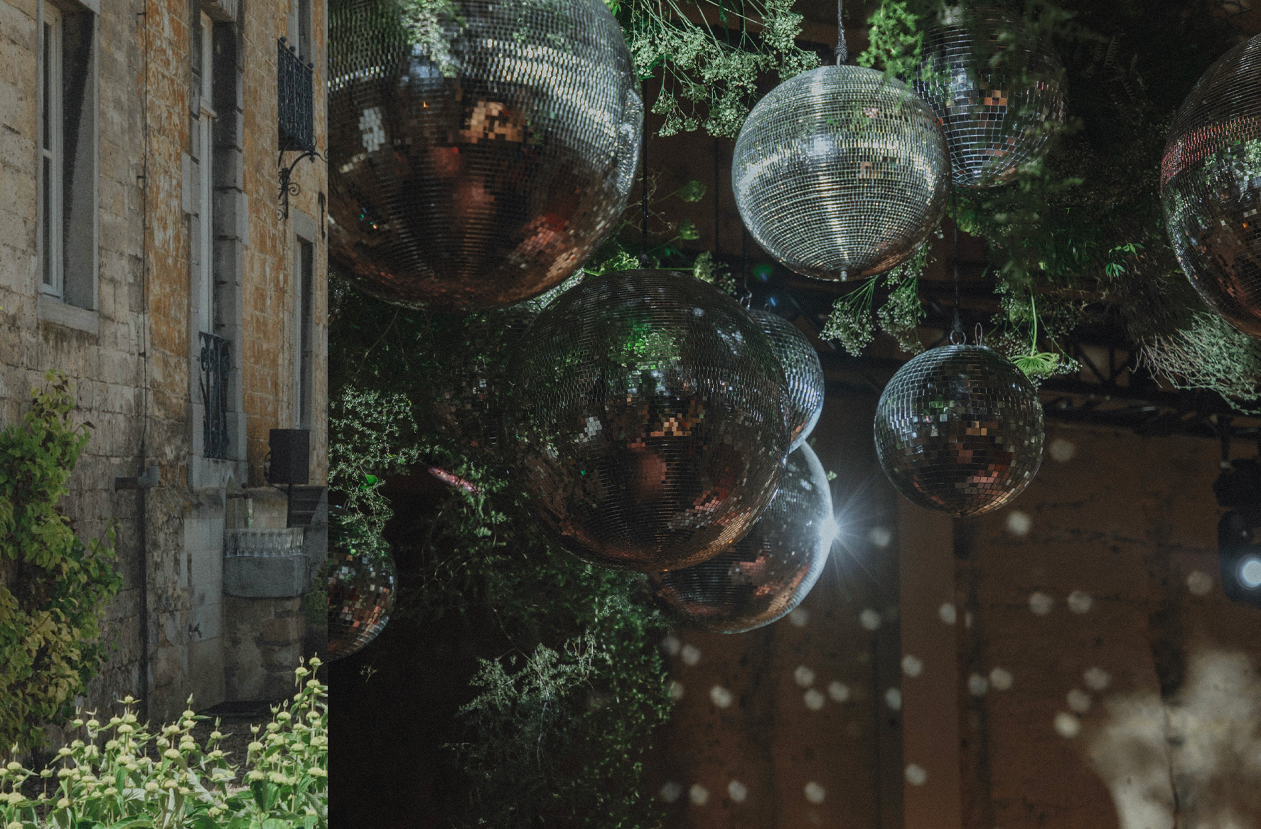 Inside, the story shifted to warmth and intimacy. Long tables dressed in white and soft florals were bathed in candlelight, while the ancient stone walls became alive with glowing niches and sculptural arrangements. Suspended greenery and mirrored spheres brought a surprising, modern edge, a subtle play of reflection and celebration.